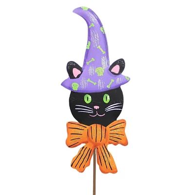 Set Of Three Black Cat Faces Wearing A Witch Hat And Purple Bow At The Neck. The Cat Wearing The Purple Hat With Green Bows And Skulls, Orange Bow Has Green Eyes. The Cat Wearing The Orange Hat With Black Stars And Green Bow With Purple Accents Has Yellow Eyes. The Cat Wearing The Green Hat With Black Stripes And Purple Bow With Spider Webs Has Yellow Eyes. Each Cat Has Pink Nose And Mouth And White Whiskers.. New.. Measurements 20.25 In H X 4 In W X .25 In D. . Assembly Required, No Tools Needed. Imported